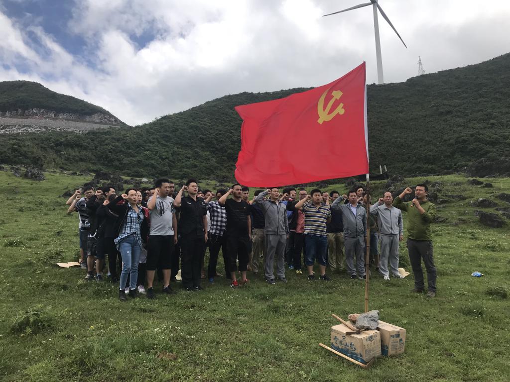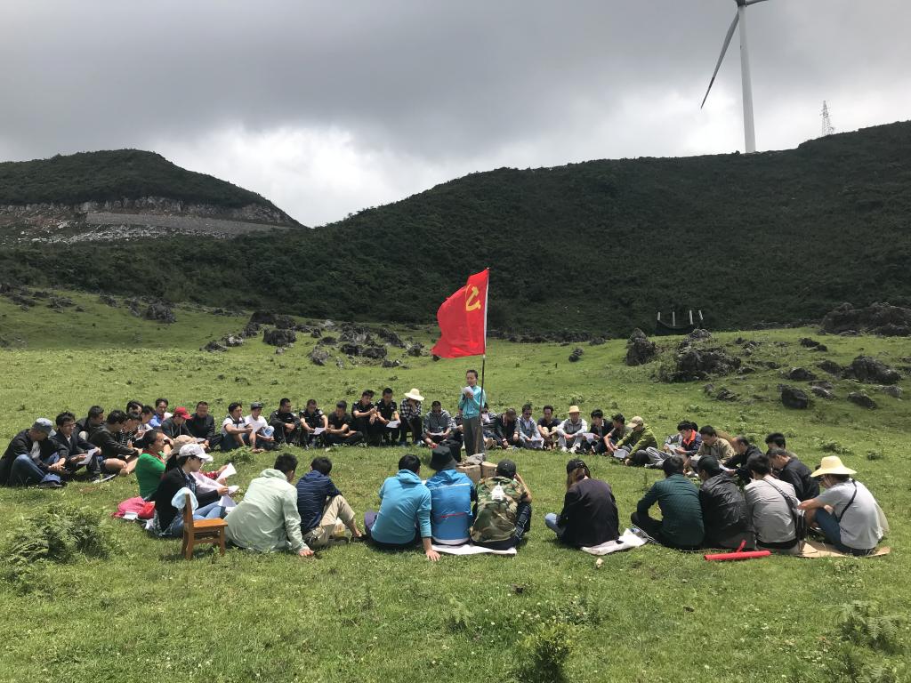 當(dāng)天,朝陽燃燒著晨霧,清晨的空氣中帶著些許熱意。一坑的60名黨員在黨旗引領(lǐng)下,浩浩蕩蕩向目的地進發(fā),徒步路線從2095老礦區(qū)開始到猴子山風(fēng)力發(fā)電站腳,共約15公里。路途中,曾在老礦區(qū)待過、年紀稍長的黨員們,指著一處處老舊破敗的建筑向年輕人介紹:“看,那里叫小街子,以前特別熱鬧,人很多”;“那是以前的糧食局”;“以前我們家就在炮臺旁邊的那幢房子里”……這就是老礦山人曾經(jīng)生產(chǎn)和生活過的地方,隨著資源的消失、生產(chǎn)中段不斷下降,老礦區(qū)已逐漸衰落蕭條;曾經(jīng)熱鬧熙攘的小街子、電影院、糧食局現(xiàn)在已無生氣,漸漸被人們遺忘。年輕黨員們看到這些景象,聽著前輩們講述曾經(jīng)打拼的故事,紛紛表示要傳承好老一輩礦山人艱苦奮斗的精神,珍惜大好機遇和礦產(chǎn)資源,為大屯錫礦的建設(shè)發(fā)展不懈努力。