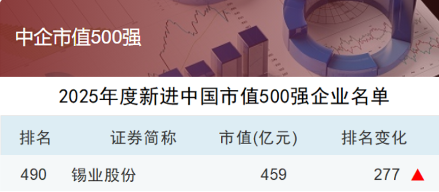 2026年1月1日,Wind 萬得發布2025年度中國上市企業市值500強榜單,錫業股份(證券代碼:000960)憑借459億元市值(較年初漲幅超過102%)位列榜單第490名,較上一年度大幅提升277位,標志著公司作為全球錫行業龍頭的市場地位與投資價值獲資本市場高度認可。