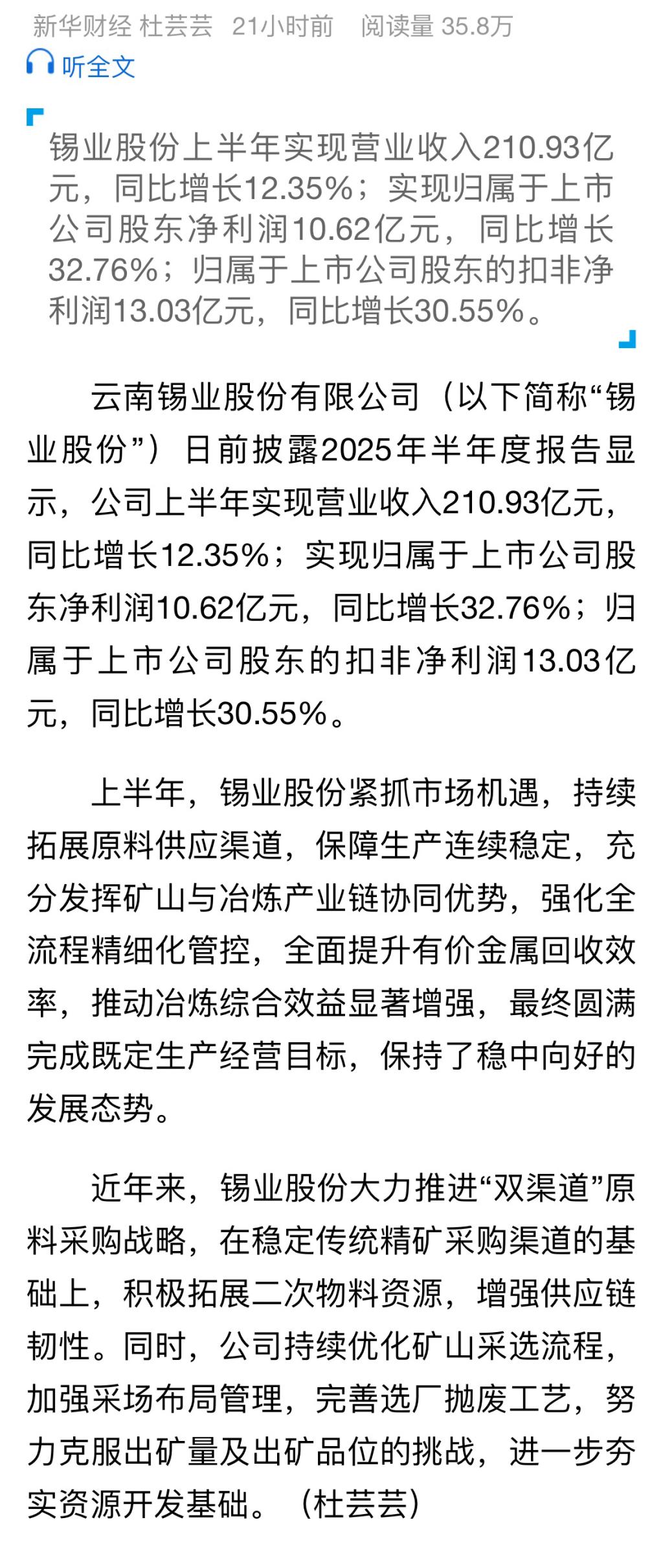 新華財(cái)經(jīng):錫業(yè)股份上半年歸母凈利潤(rùn)同比增長(zhǎng)32.76%