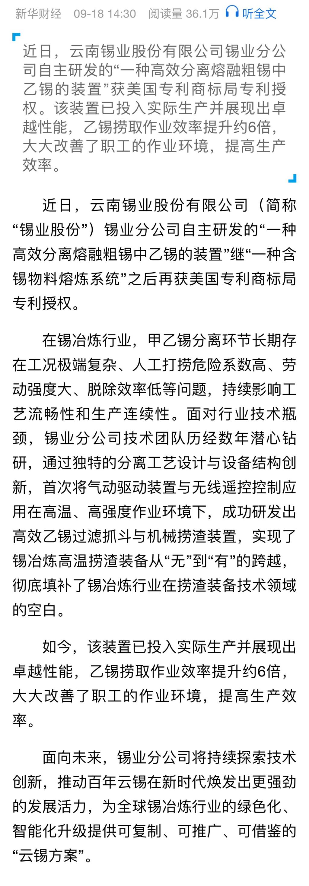 新華財經(jīng):錫業(yè)分公司創(chuàng)新成果再獲美國專利商標(biāo)局授權(quán)