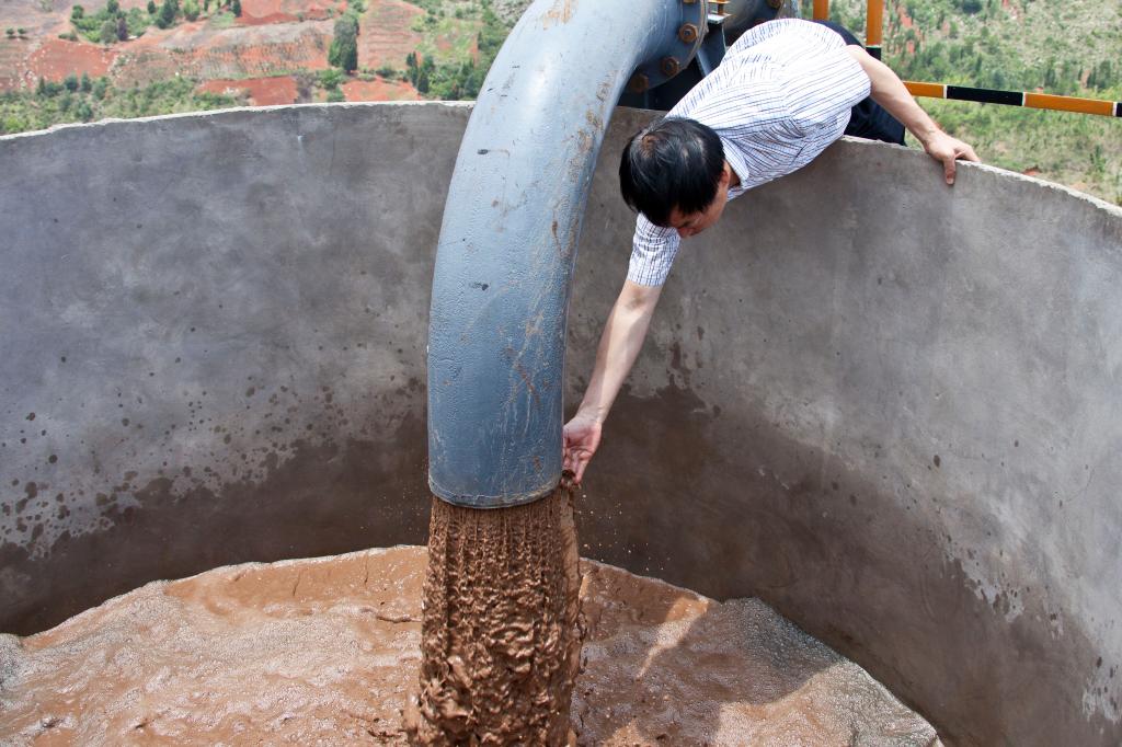 12時(shí)40分左右,17米多高的花墳二次濃縮塔緩沖池旁,站滿了施工及前來(lái)目睹第一管尾礦輸出的各路人馬,人們默默地屏住呼吸,神色凝重地盯著輸送管的出水口。13時(shí)整,輸送管存水由清漸濁,隨著幾聲“撲通、撲通”的聲響,尾礦泥漿以“濃濃”的情意、像帶著人們的重托和長(zhǎng)久期盼,由輸送管道遠(yuǎn)遠(yuǎn)奔騰而來(lái),暢快地一泄而出……